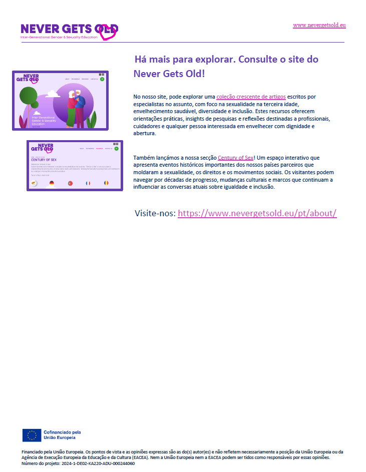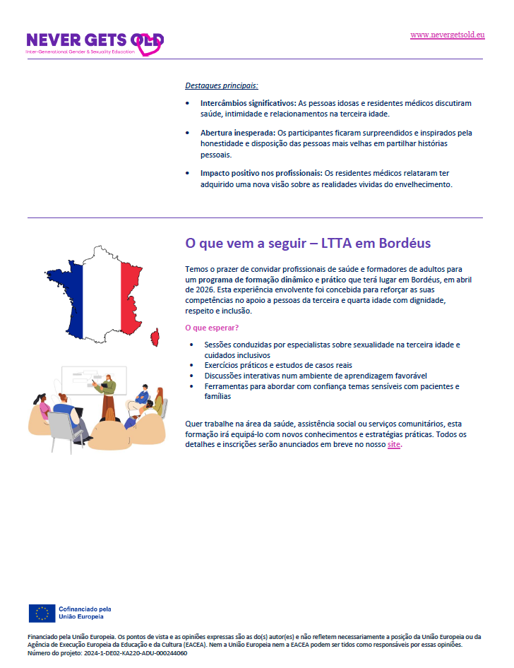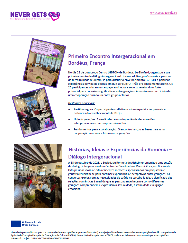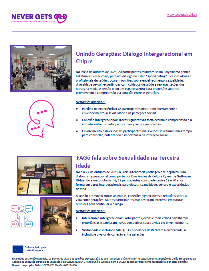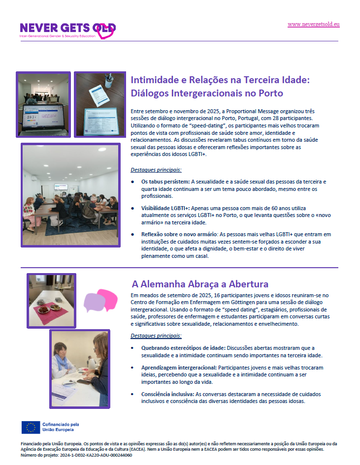 Nos últimos meses, os parceiros do projeto promoveram sessões inspiradoras de diálogo intergeracional em vários países europeus, criando espaços seguros para conversas honestas entre pessoas mais velhas e profissionais de saúde. Através da metodologia de speed dating, estas iniciativas desafiaram estereótipos e valorizaram a diversidade de experiências relacionadas com o envelhecimento, a identidade, as relações e a sexualidade.